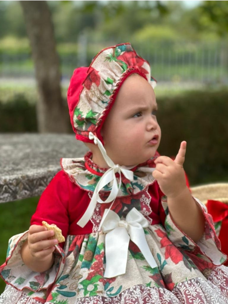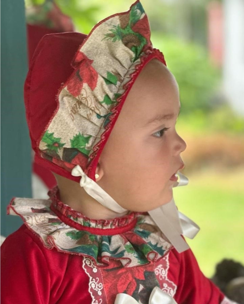 Sonata Infantil Spanish girls Christmas print bonnet. Matching dresses are available to order here. This item is made to order and will take between 6-8 weeks to arrive from the order date.