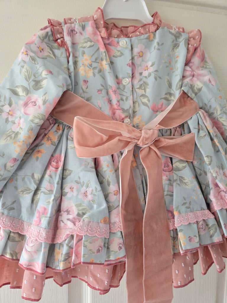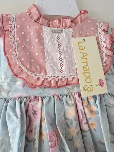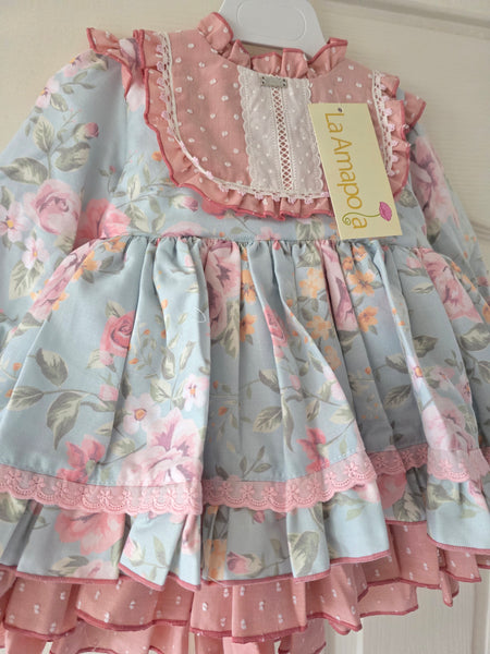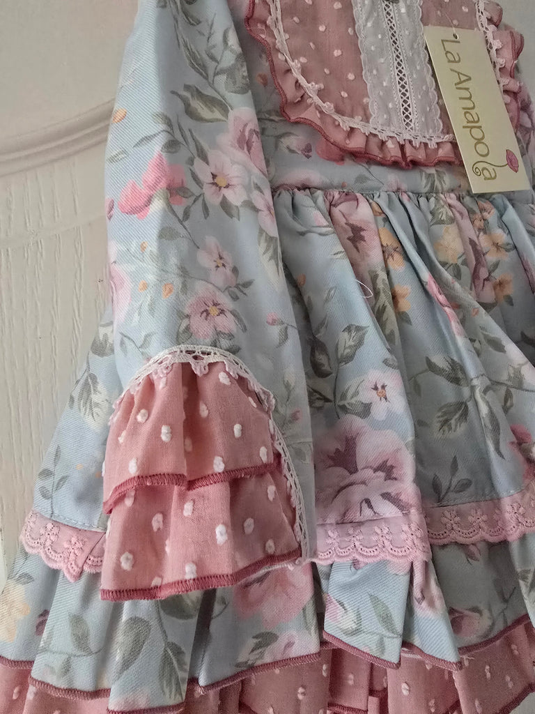 La Amapola Spanish Girls Blue & Pink Floral Dress ~ 3,10y