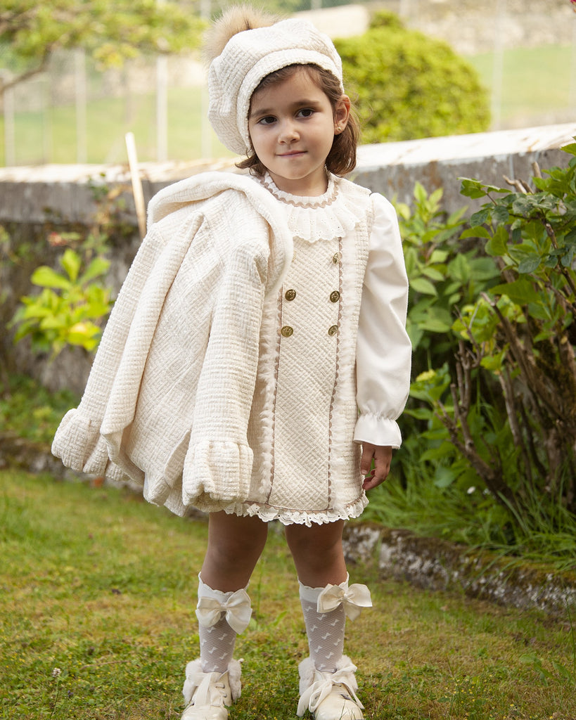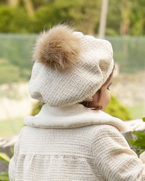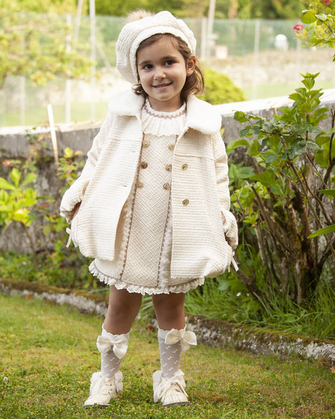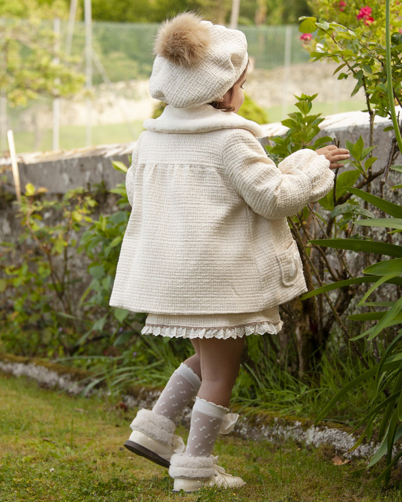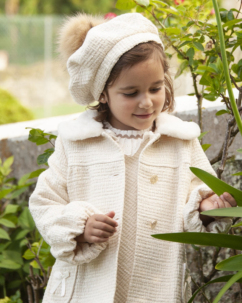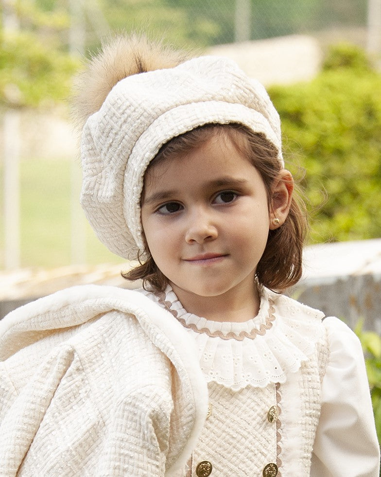 This item is made to order and takes approximately 8 weeks to arrive from the order date. Spanish luxury girls cream fur jacket by Sonata Infantil. The dress set the model is wearing can be found here. And the beret is here.