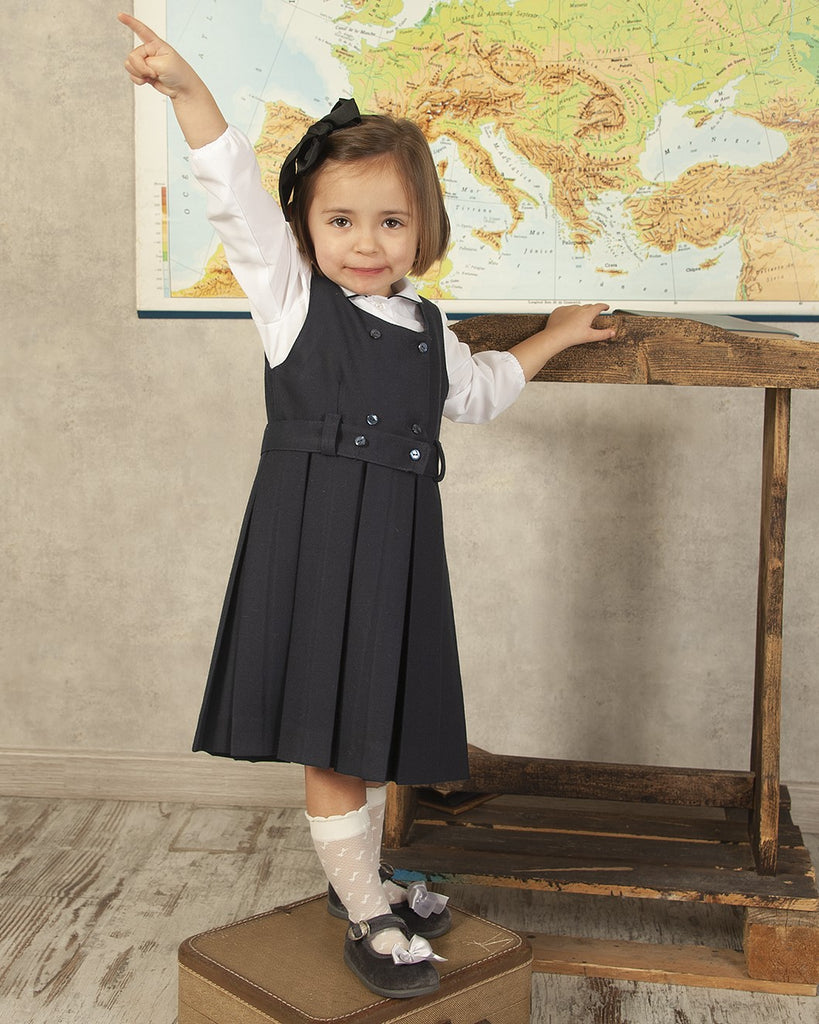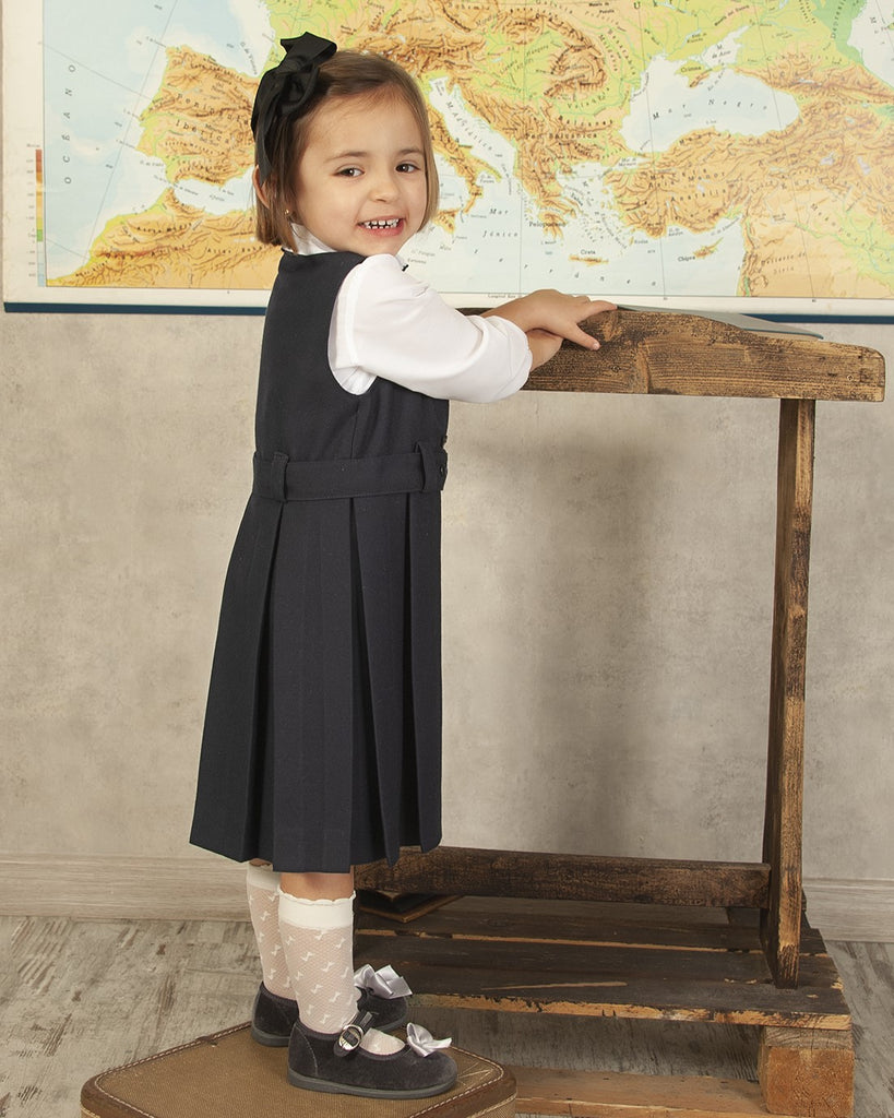 Sonata Infantil Spanish girls belted school pinafore dress. The blouse isn't included but is available to order seperately here. These products are handmade to order in Spain and take approximately 6 weeks to arrive from the order date. If you need the garment sooner, please contact us before ordering so we can enquire with Sonata. Kindly note, items which are made to order are exempt from returns as they are ordered in by customer request..