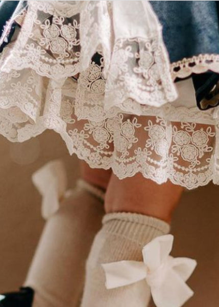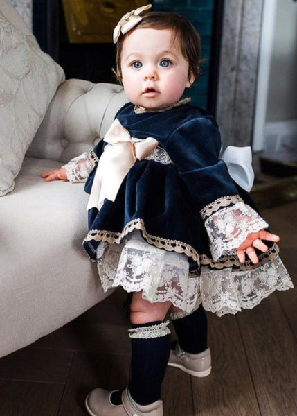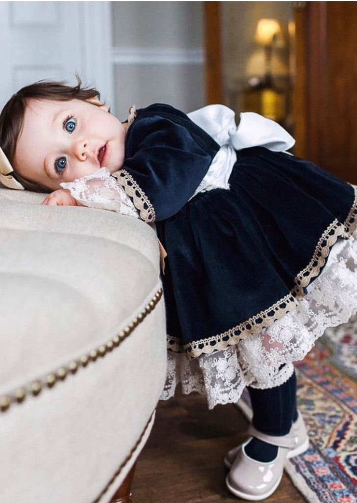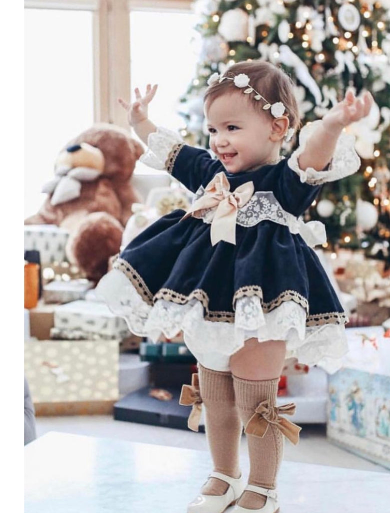 Sonata infantil Spanish girls navy velvet puffball dress with delicate lace trim and a gold chest bow. This dress can also be made in green, red and burgundy velvet. This item is made to order and takes approximately 8 weeks to arrive from the order date (if you need the item sooner please message us to discuss this)