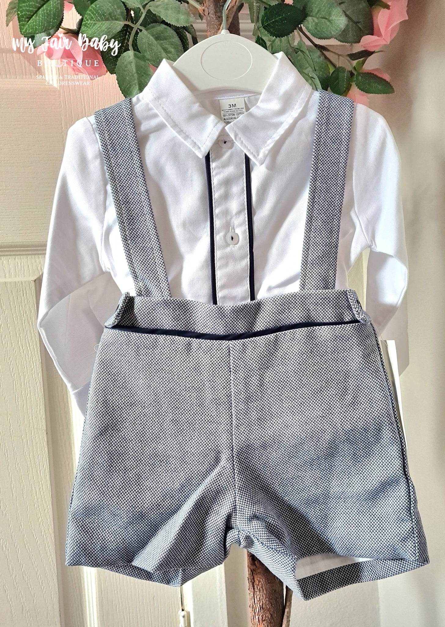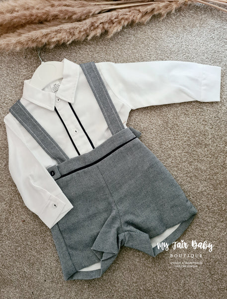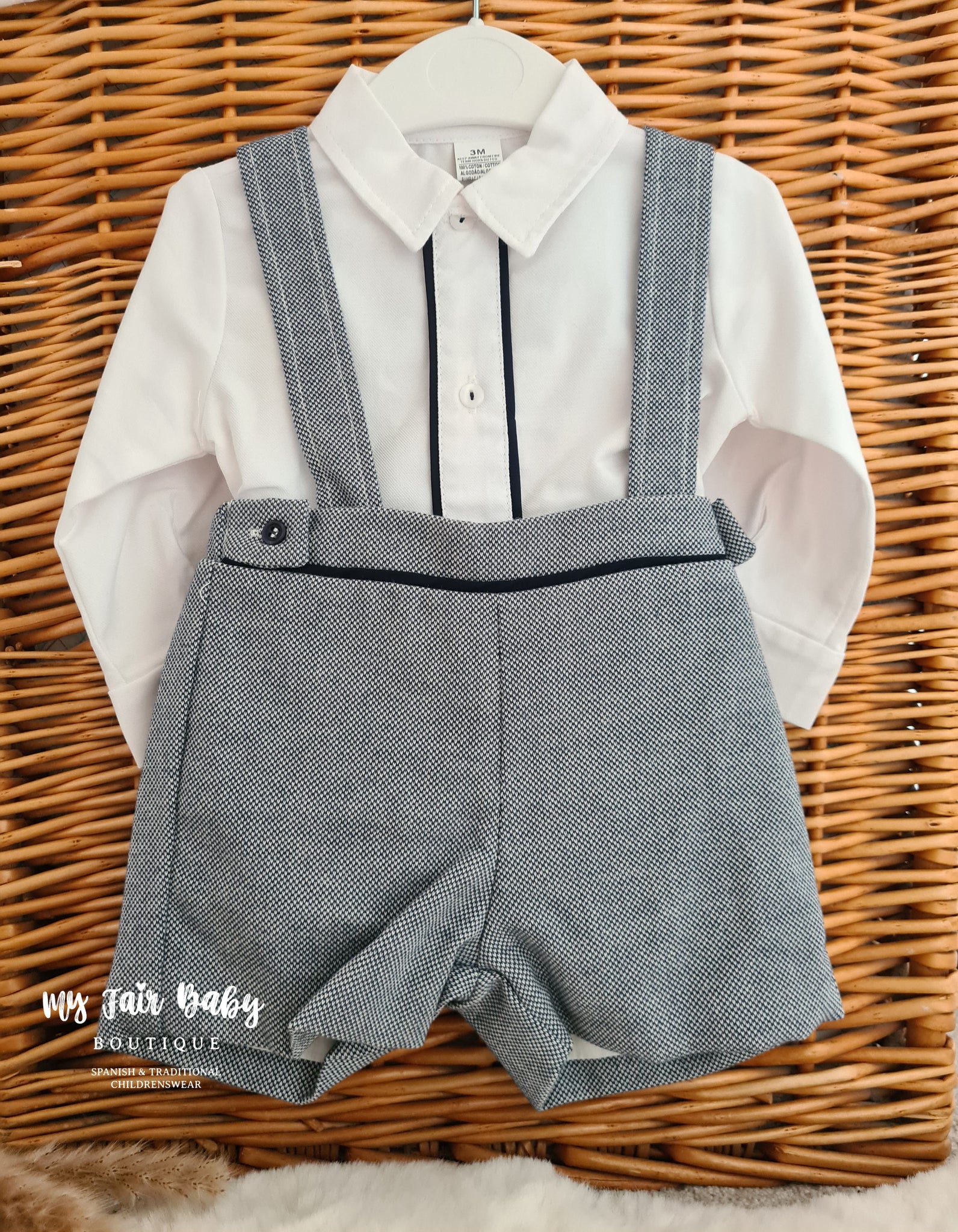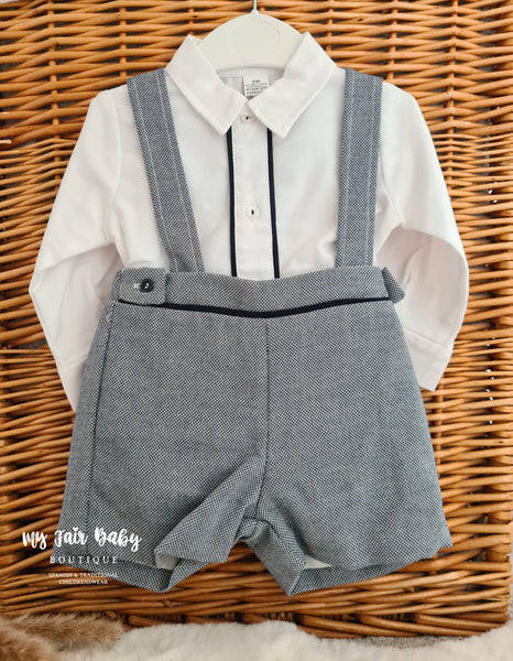 Spanish baby boys navy dungarees. Matched with a white cotton shirt with navy trim. True to size fitting. Also available in grey.