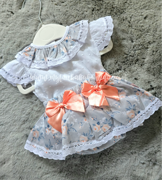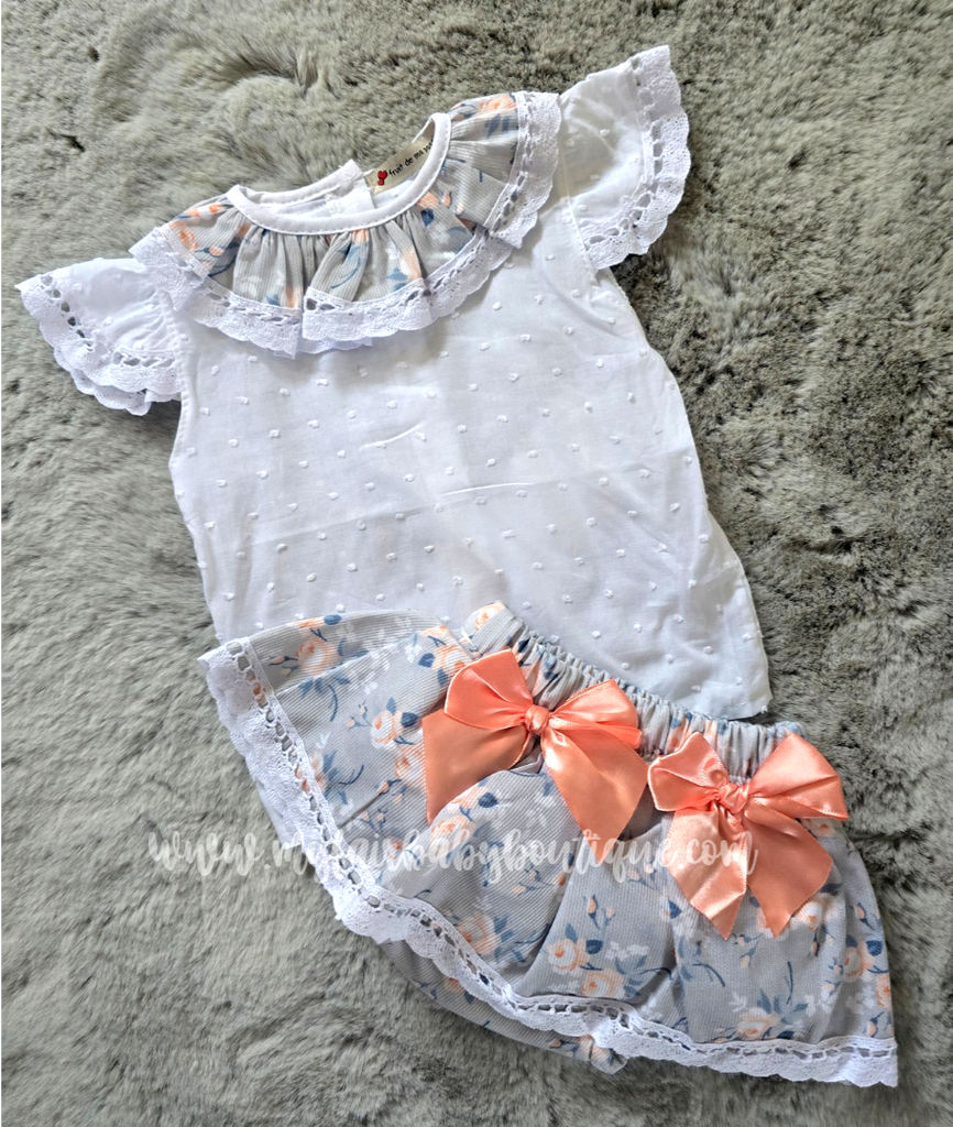 Spanish baby girls grey floral skort with peach satin bows. Complete with a white short sleeved plumeti blouse. True to size fitting.