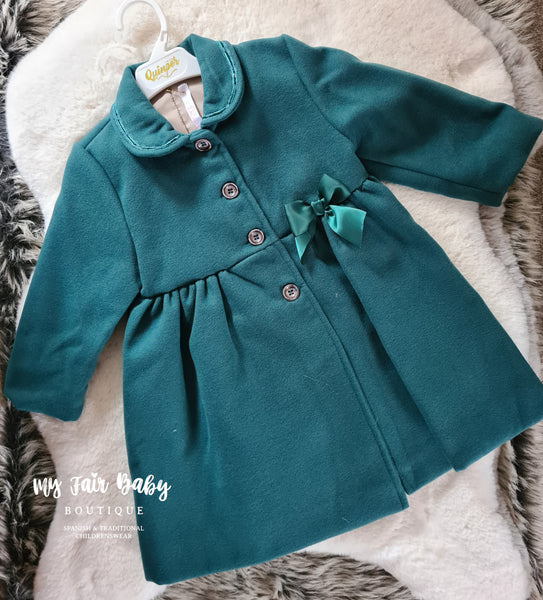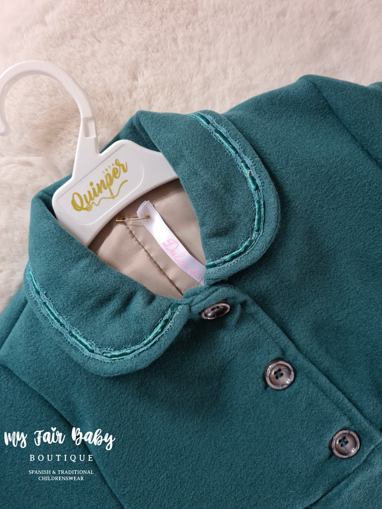 Traditional Spanish toddler girls bottle green coat with button fastening. Slightly small on sizing