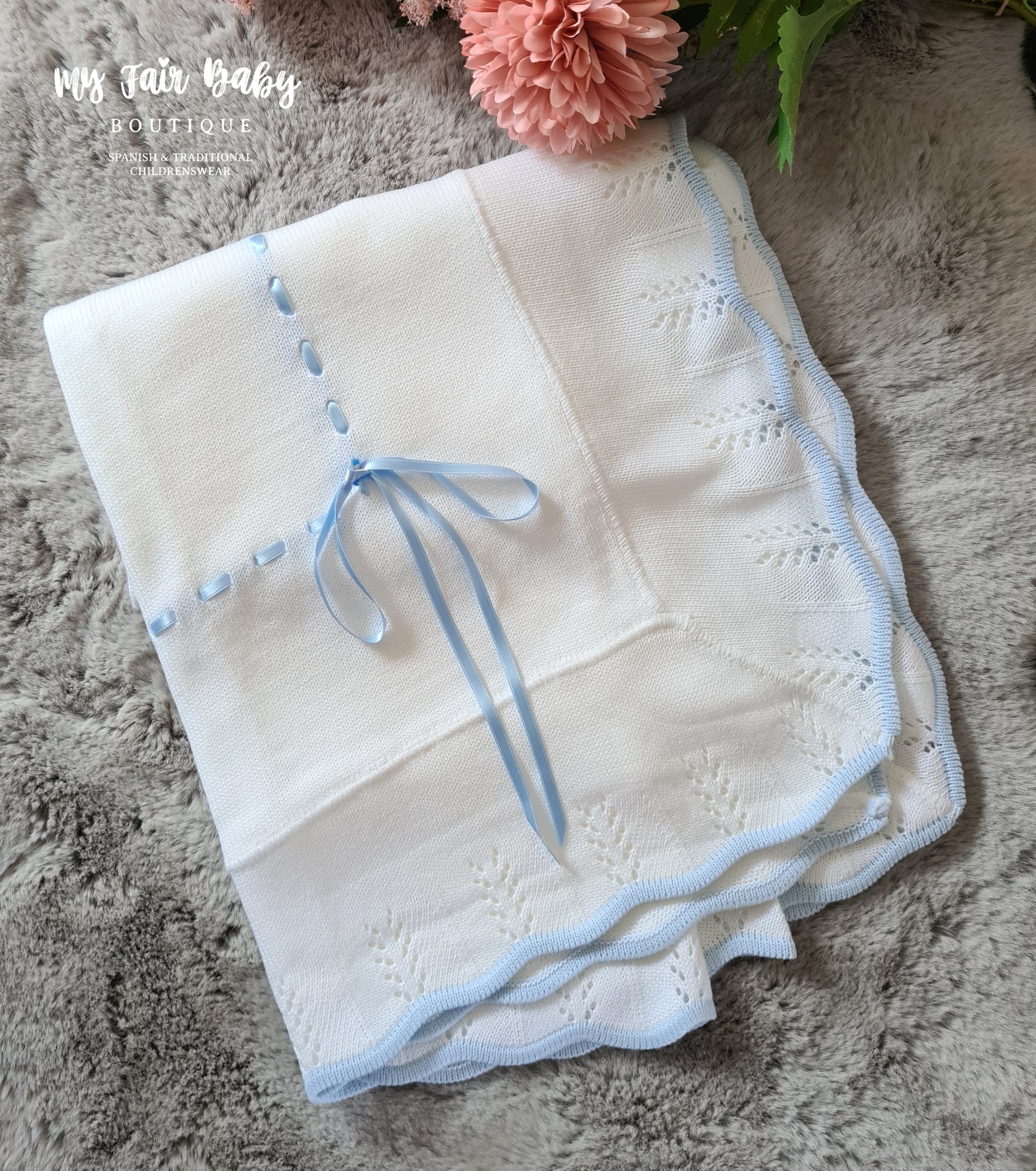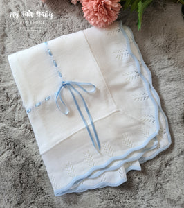Spanish Style Baby Boys White & Blue Ribbon Slot Shawl / Blanket