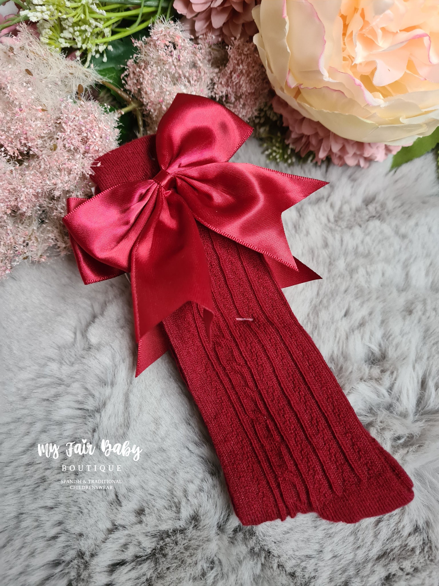Spanish style baby girls burgundy knee high socks with a large satin side bow. Other colours are available.