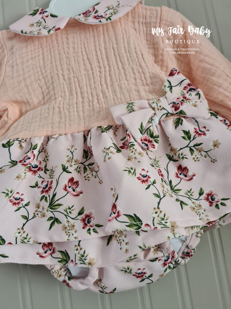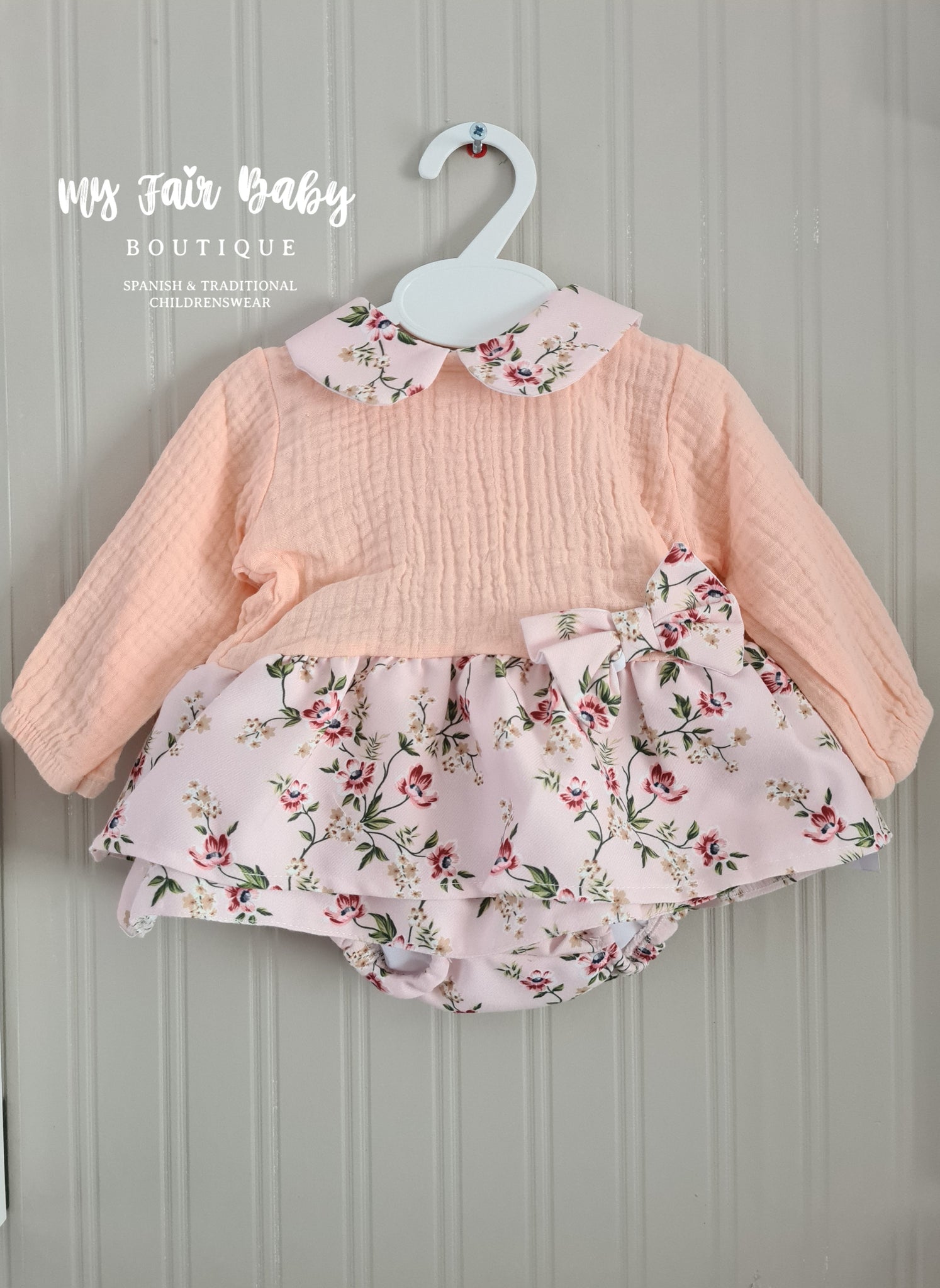 Spanish baby girls beautiful peach two piece set. Features a long sleeved top with full reverse button fastening. Matched with a pair of floral jam pants with frills and satin bows to the front. This product fits true to size.