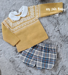 Spanish baby boys mustard jumper with a pique collar. Matched with a pair of tartan shorts.