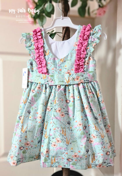 Spanish BabyFerr older girls green and cerise floral summer dress with front bows and reverse button fastening. Matching baby girls dress available separately. Small on sizing.