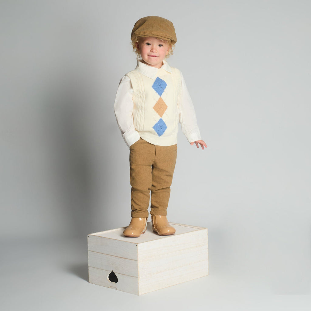 Beau kid traditional boys argyle tank top set. Comprising of a pair of camel trousers with an adjustable waistband. A cream argyle tank top, a long sleeved cotton shirt and matching flat cap. True to size fitting. The boots are available seperately