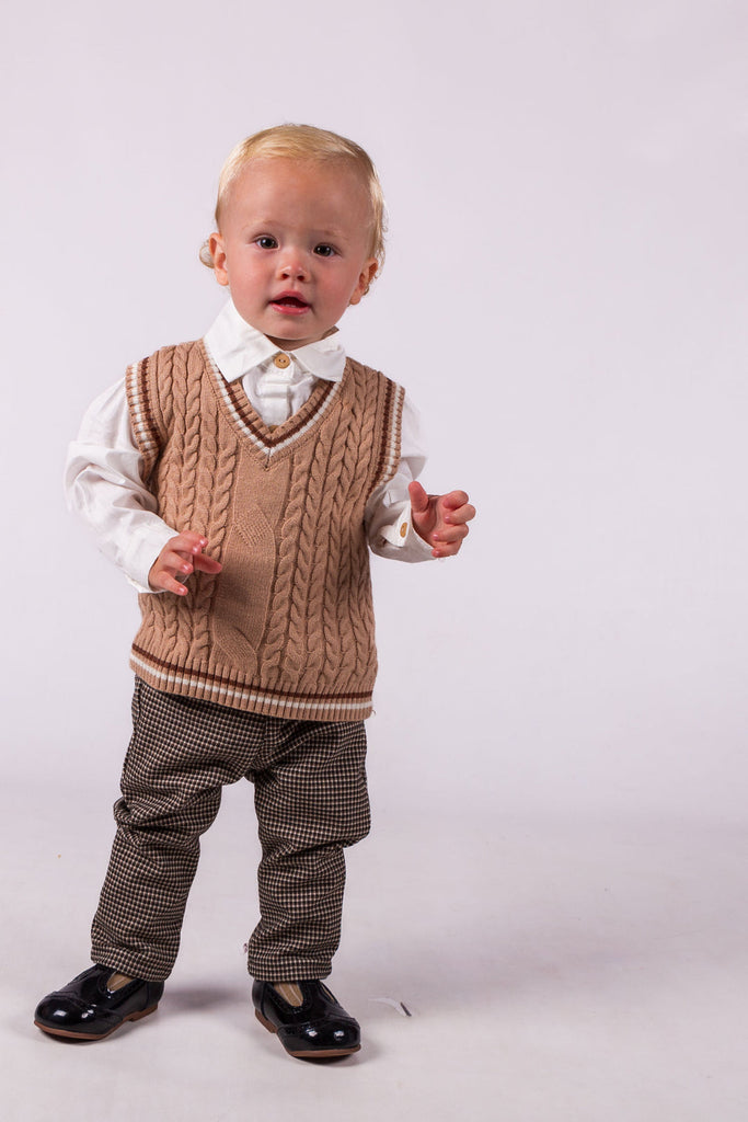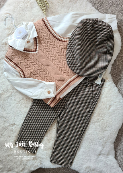 Beau Kid Traditional baby boys 4pc Set. Comprising of a pair of brown check trousers, a shirt, a camel knitted tank top and a matching hat. True to size fitting.