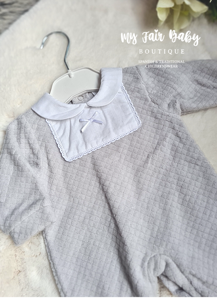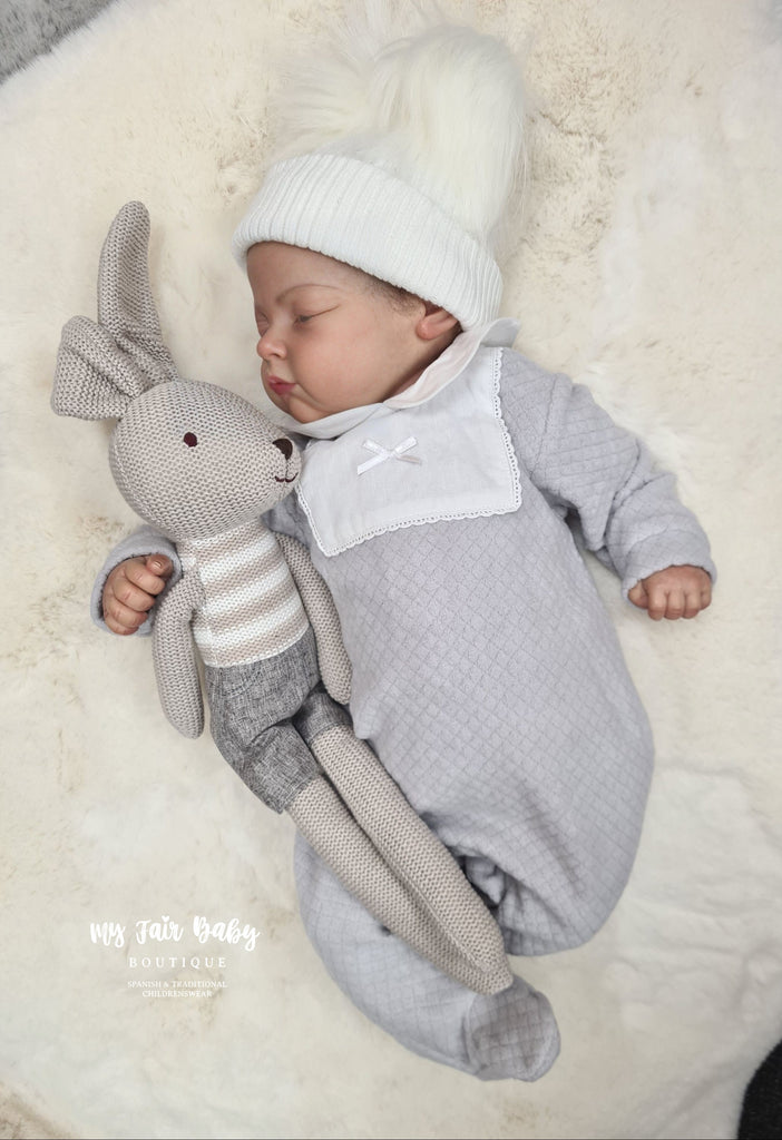 Traditional unisex baby grey velour with white bib and bow detailing. Popper fastening to the back and legs. The pom pom hat is available here. And the knitted rabbit toy is available here.
