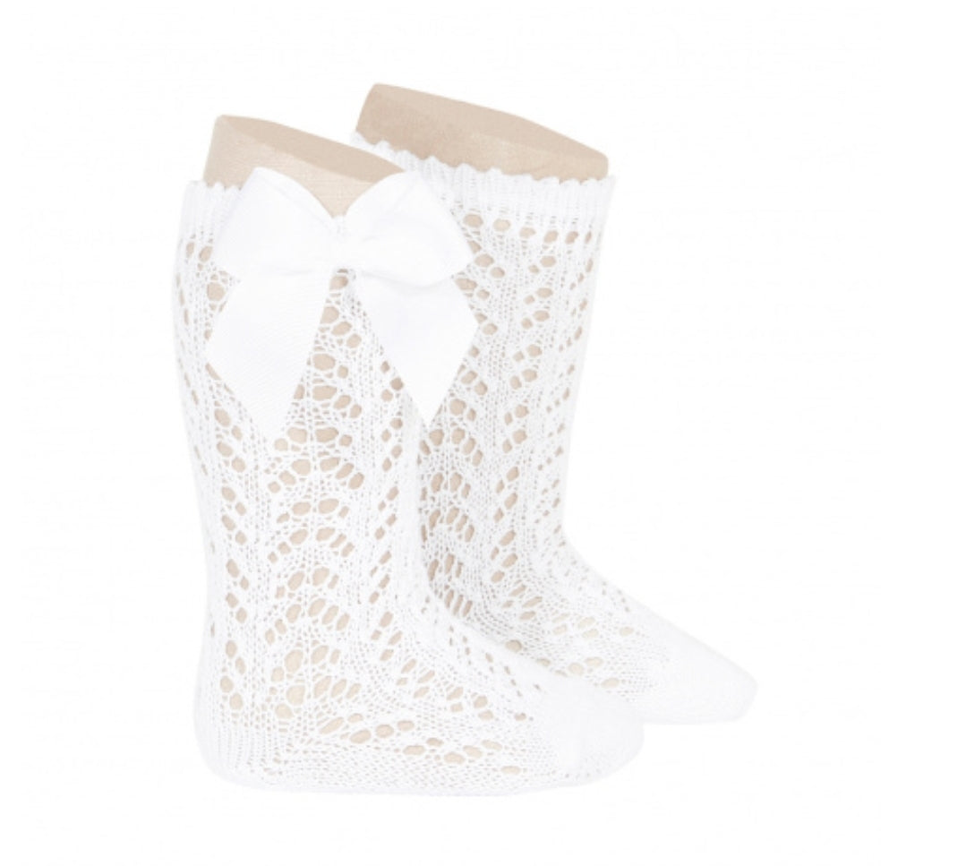 Condor Spanish girls cotton openwork knee high bow socks in colour shade White 500.