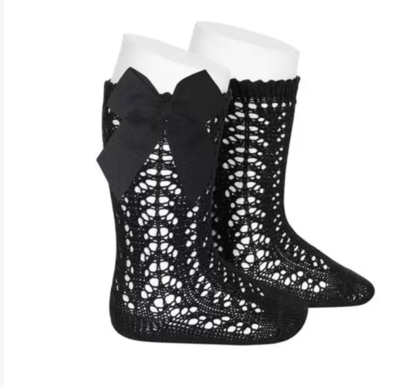 Condor Spanish Girls Cotton Openwork Knee High Bow Socks - BLACK 900