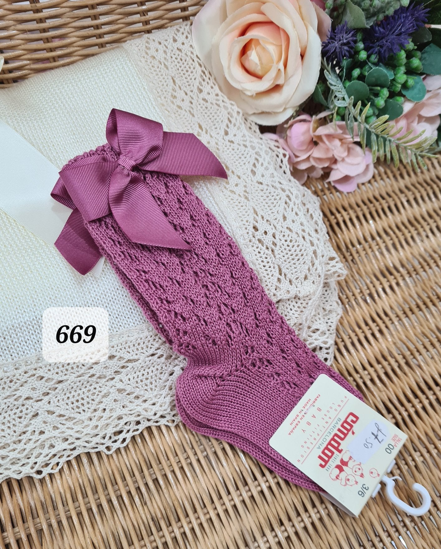 Condor Spanish girls cotton openwork knee high bow socks in colour shade Berry 669