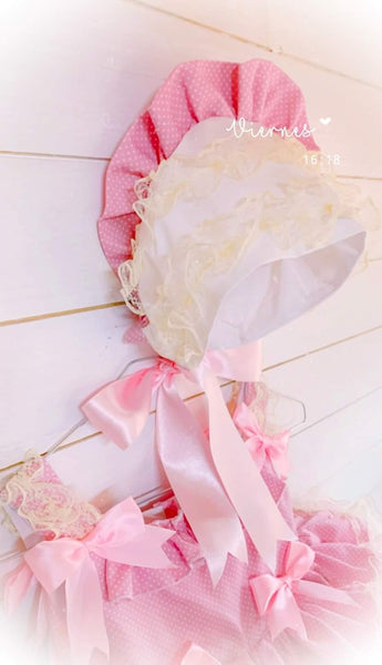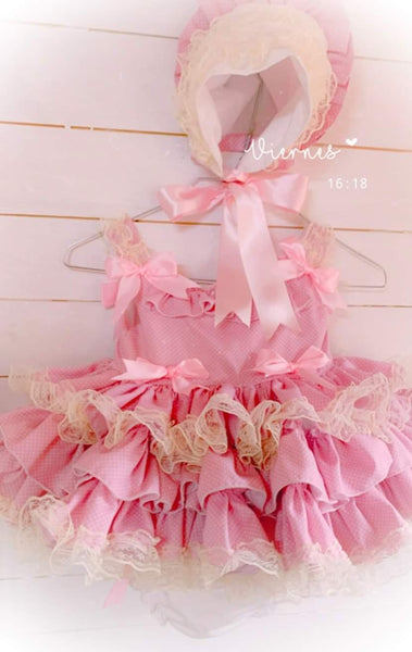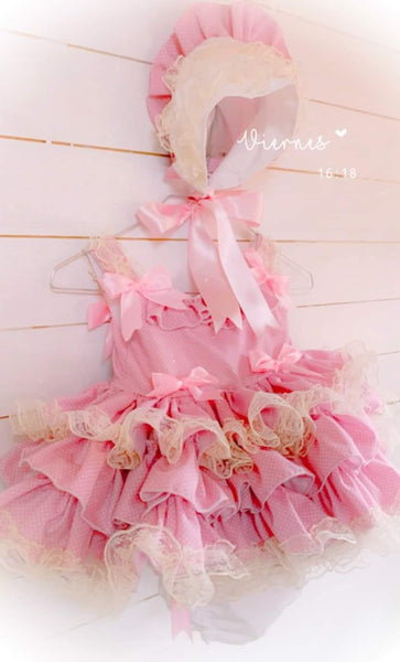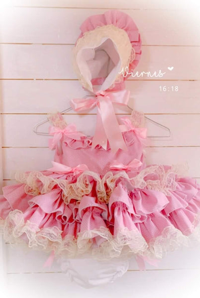 Ela Confeccion Spanish girls pink puffball dress with cream lace detailing. Matching pants are included. Matching bonnet is optional. Small on sizing, we recommend ordering a size up. The dress is very short & puffy.