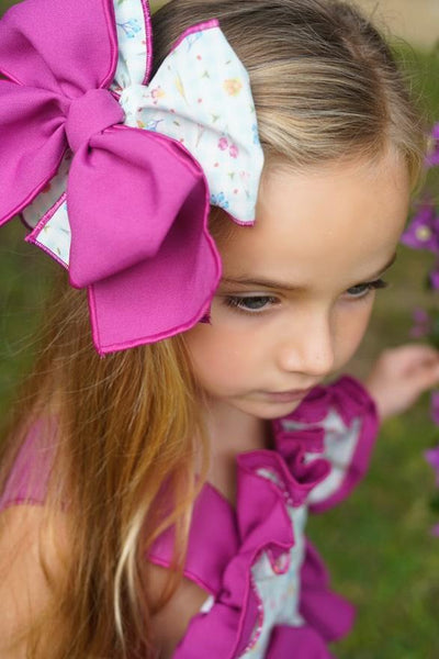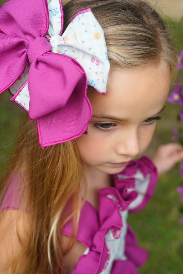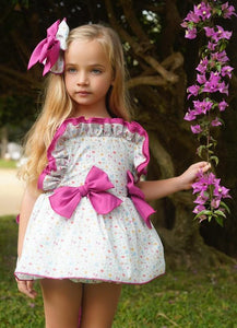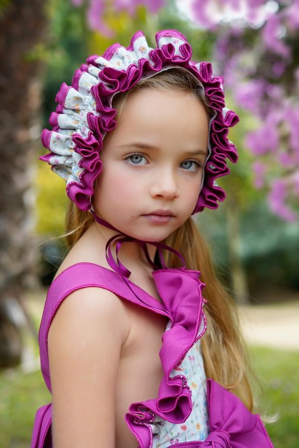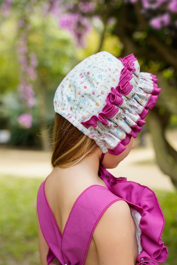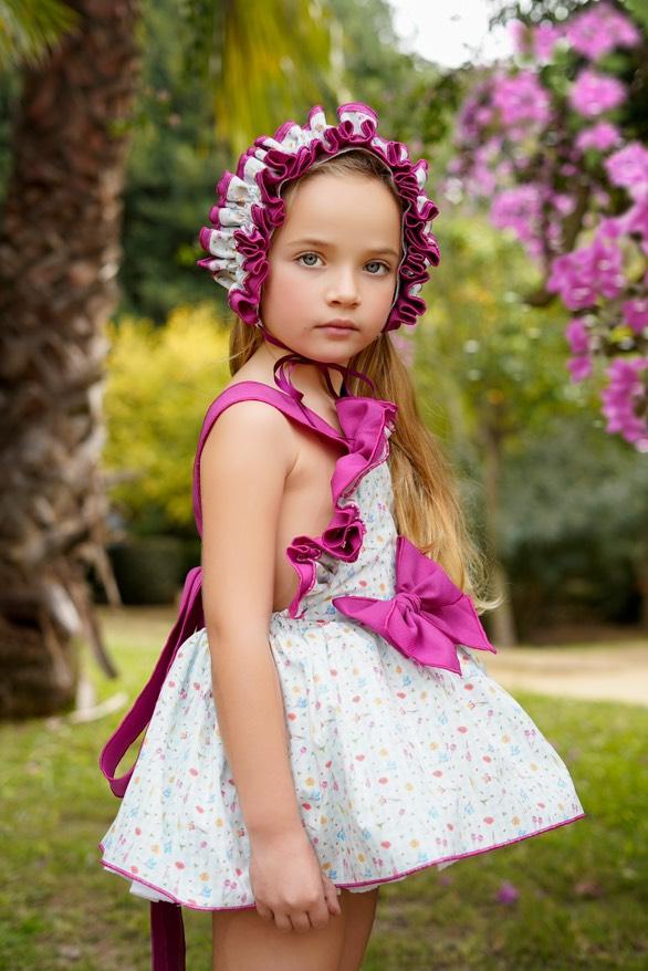 Ela Confeccion SS25 Spanish girls hot pink floral sun dress. Complete with matching pants and a choice of a hair bow or a bonnet. The matching jacket is available separately here. Please note this item is made to order and takes approximately 4 weeks to arrive from the order date. Small on sizing, we recommend ordering a size larger.