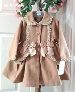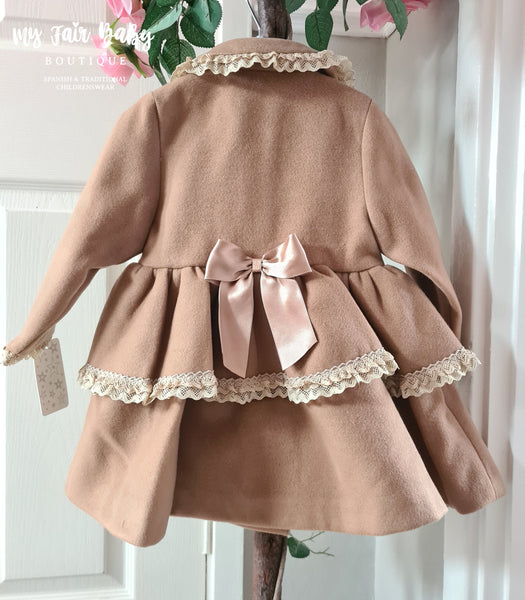 Traditional Spanish baby girls camel winter coat with beautiful lace detailing, front chest bows and button fastening. Finished with a large bow to the back. True to size fitting.