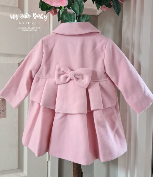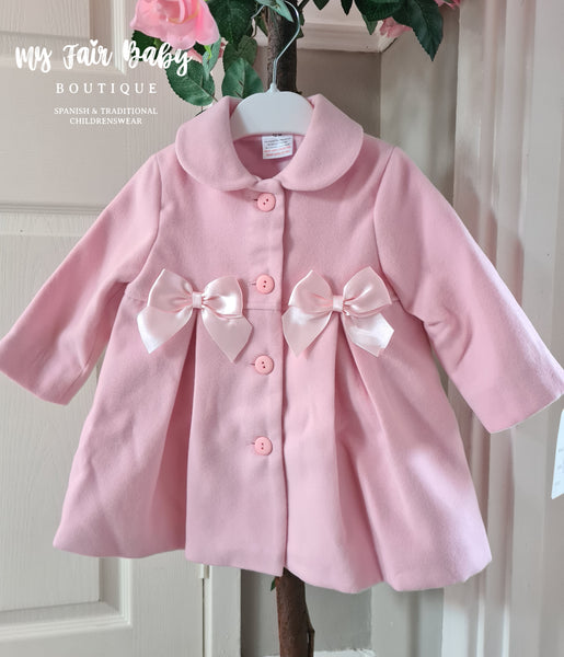 Traditional Spanish baby girls pink winter coat with front chest bows and button fastening. Finished with a large bow to the back. True to size fitting.