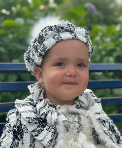 Sonata AW23 cream & black tweed style beret with pom pom. Matching coat is available separately here. Made to order and takes approximately 8 weeks to arrive from the order date.