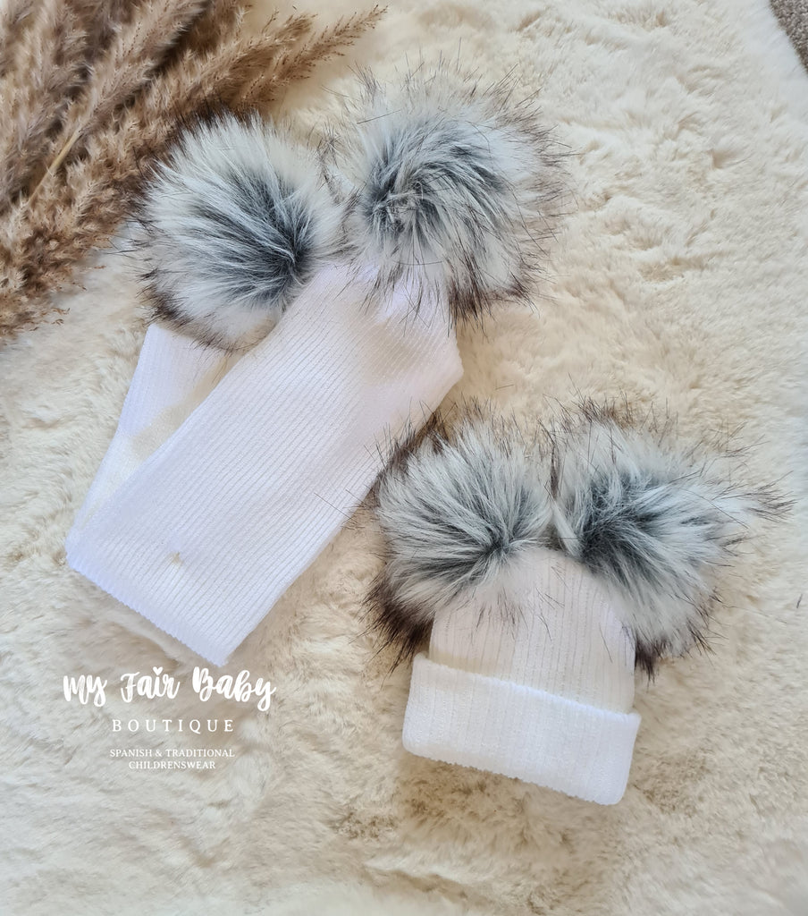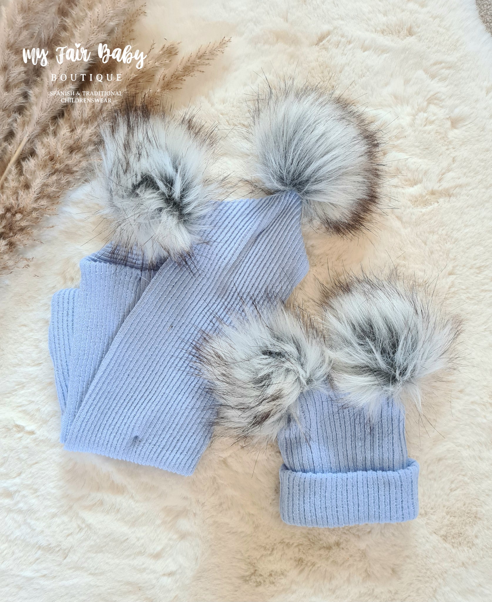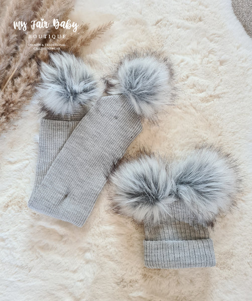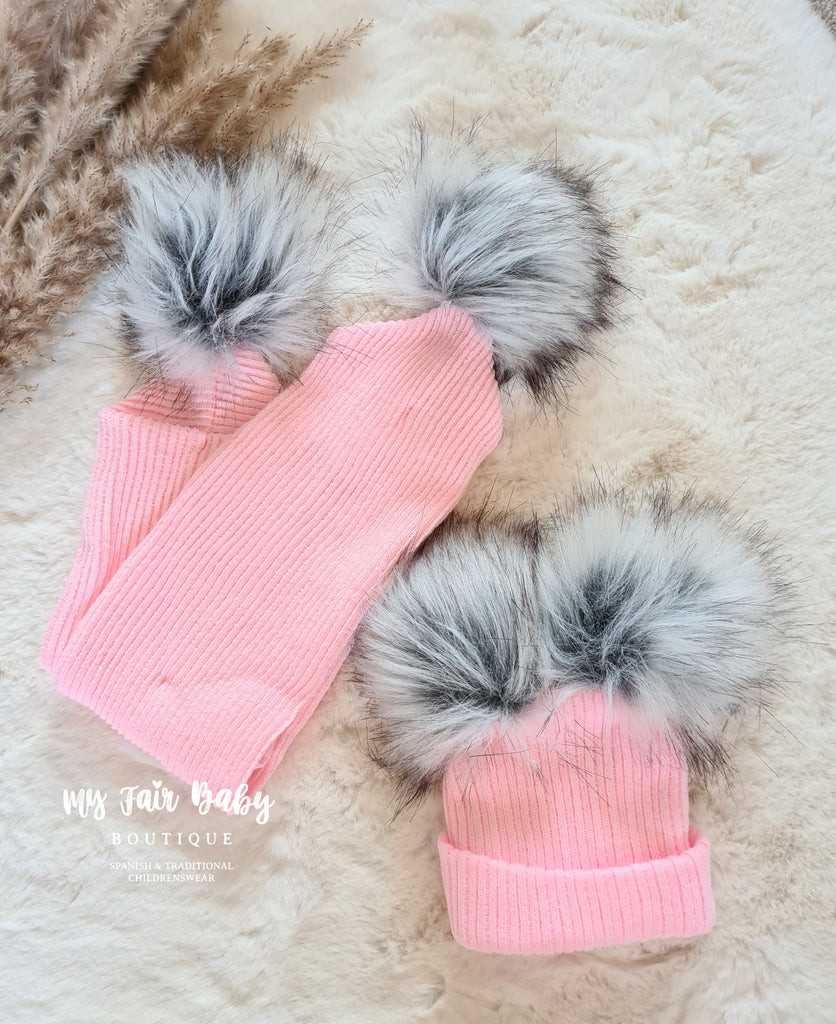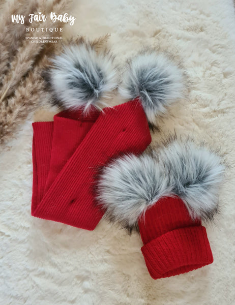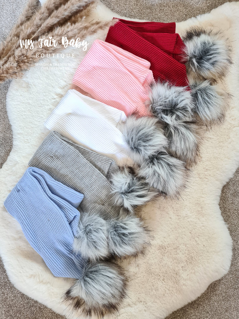 Traditional toddler ribbed scarves with grey faux fur pom poms. Matching hats are available separately here.