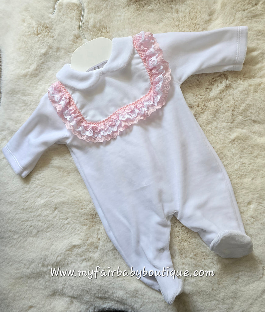 Spanish Baby Girls White & Pink Lace Trim Velour Sleepsuit / Babygrow - NB-3m