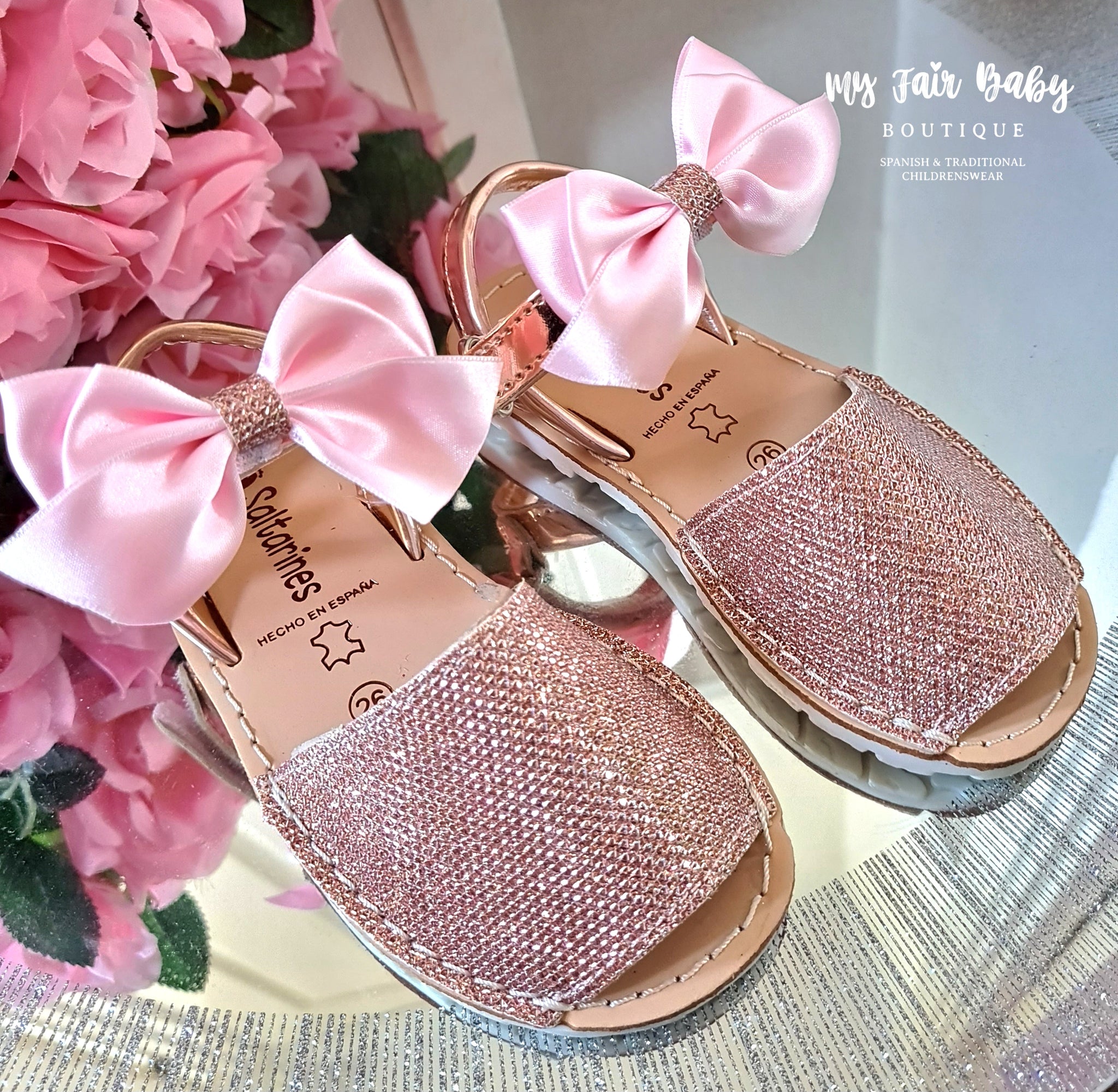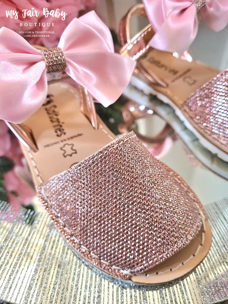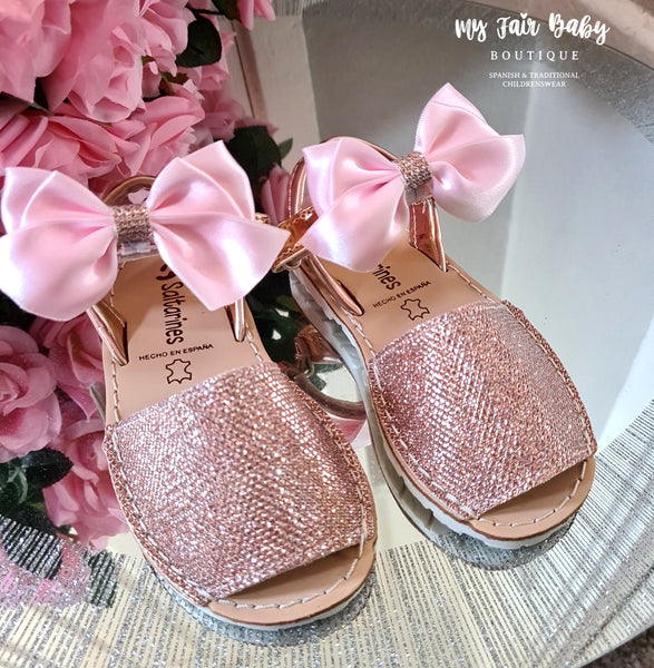 Spanish girls pink sparkle sandals with detachable bows and velcro fastening. Features a back strap for support. Saltarines branded. True to size fitting. These items are reduced to clear and are non returnable.