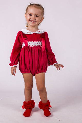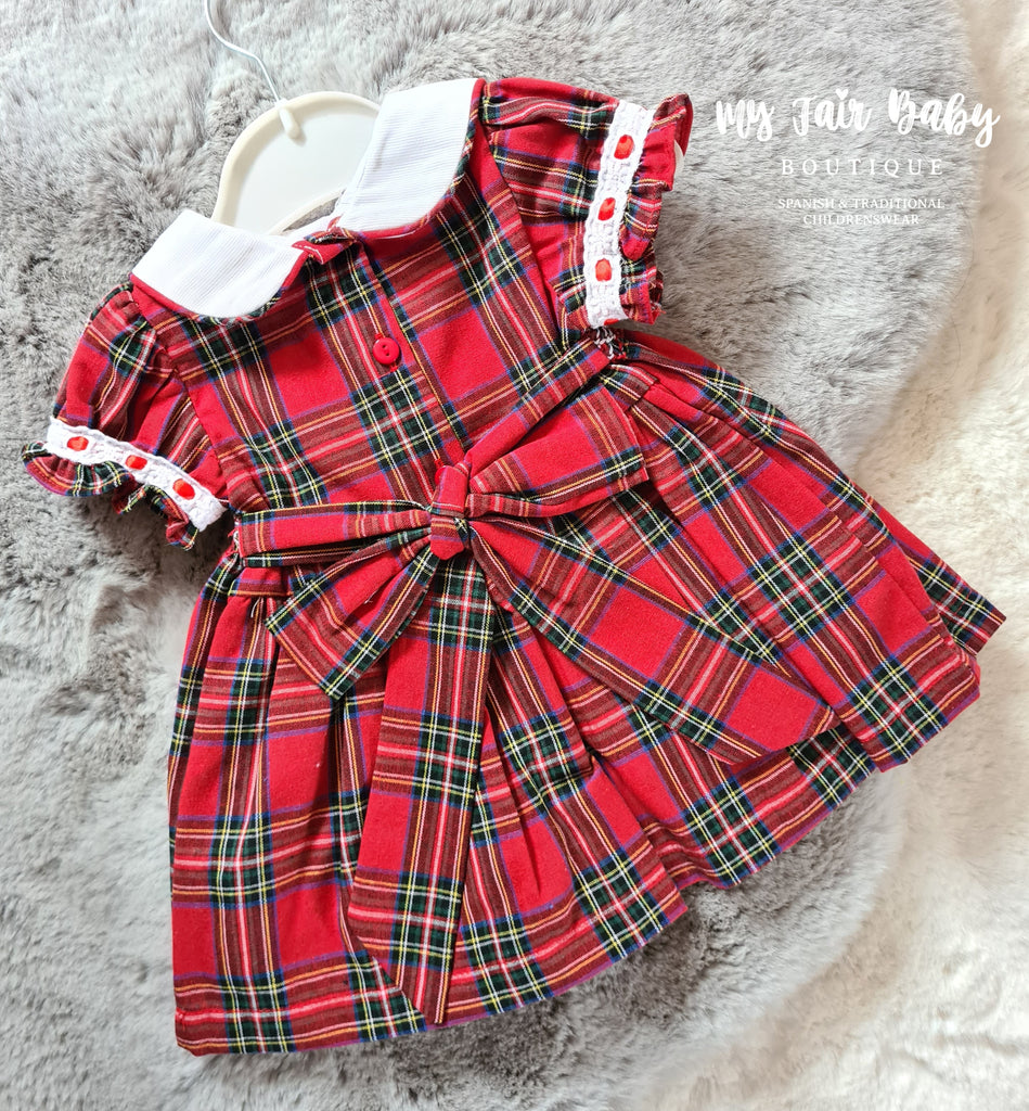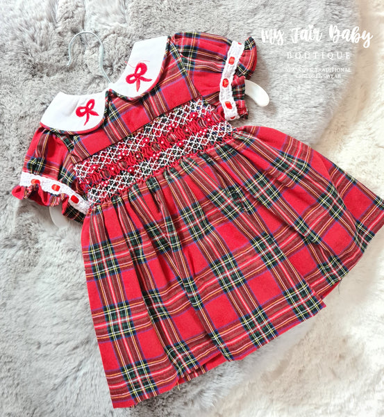 Beau Kid Traditional Girls Red Tartan dress with chest smocking and ribbons to the sleeves. True to size fitting.