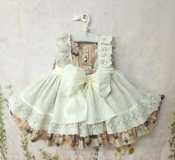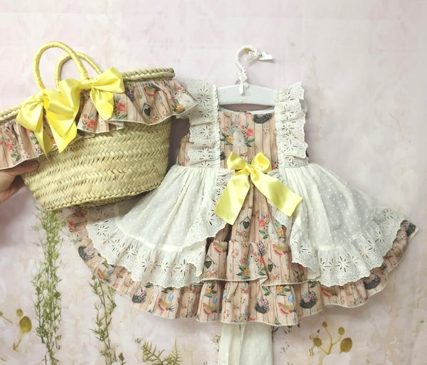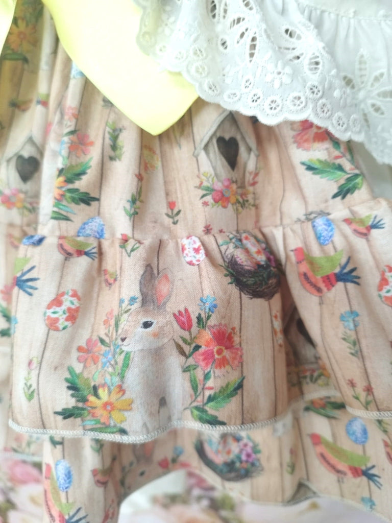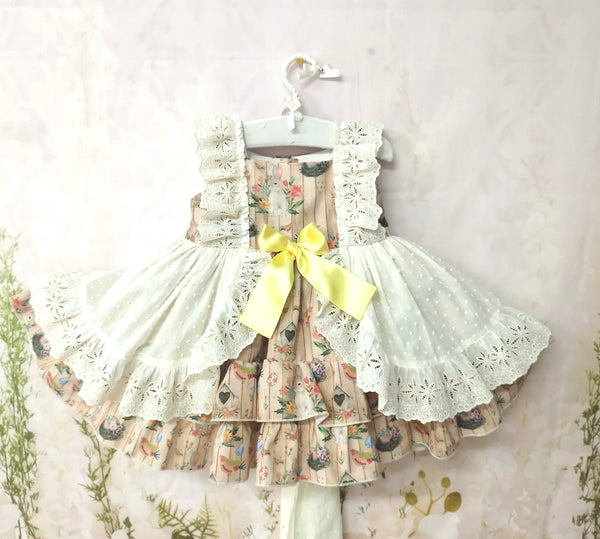 Sonata Infantil Spanish girls Easter print dress with ruffles and a large satin chest bow. True to size fitting. Optional matching bonnet available in the listing. Also available - Lace lemon bow socks, pink bow socks, bow shoes, older girls pinafire skirt set, baby boys dungarees, basket bag and a dog coat. This item is made to order and takes approximately 8 weeks to arrive from the order date.   Kindly note items which are 'made to order' are exempt from a return as they are ordered in by customer request. If you need measurements, please contact us before ordering.