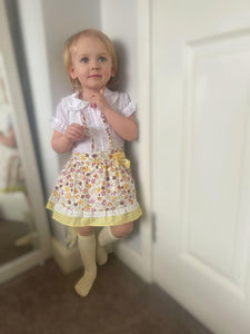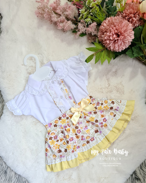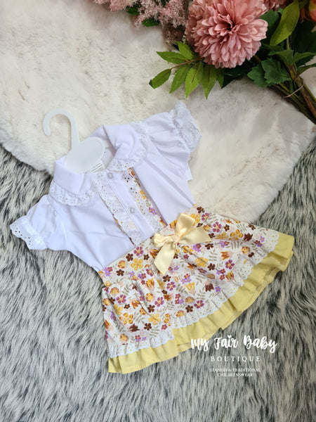 Spanish baby girls lemon floral skirt with satin bow detailing. Complete with a coordinating blouse.