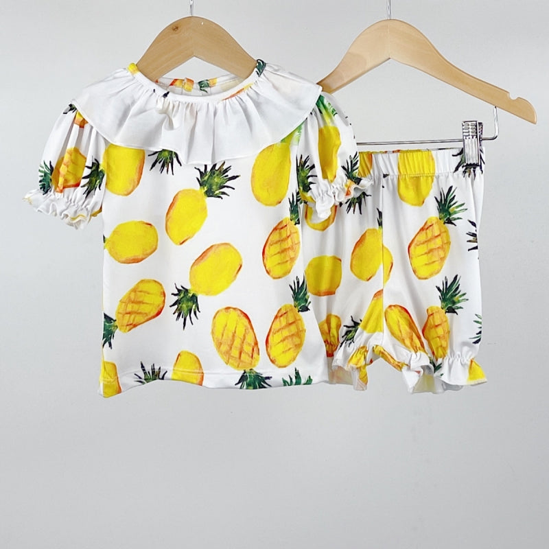 Spanish style top with pineapple fruit print, round frilled collar and puffed short sleeves paired with co-ord shorts.