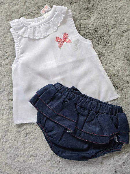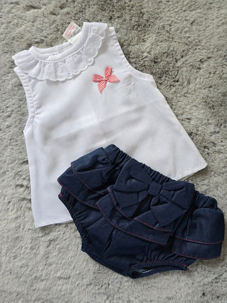 Spanish baby girls white sleeveless top with a frilly collar and small red chest bow. Matched with a pair of navy pants with ruffles and a front bow.