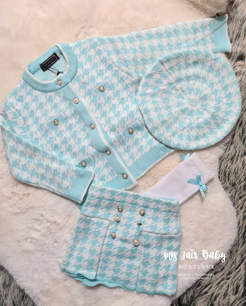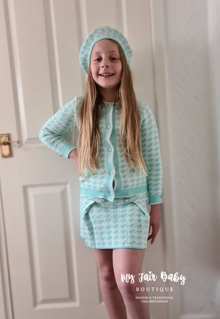 Traditional girls mint green and white knitted skirt, jacket and beret set with matching bow socks. These are generous on sizing. Also available in lilac, baby pink & mint green.