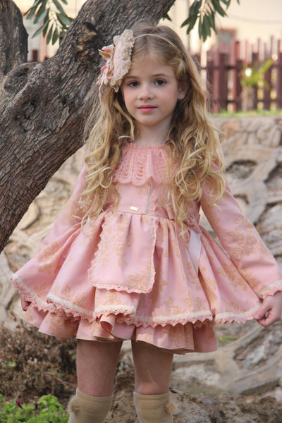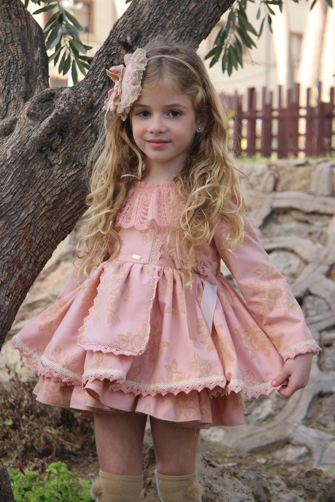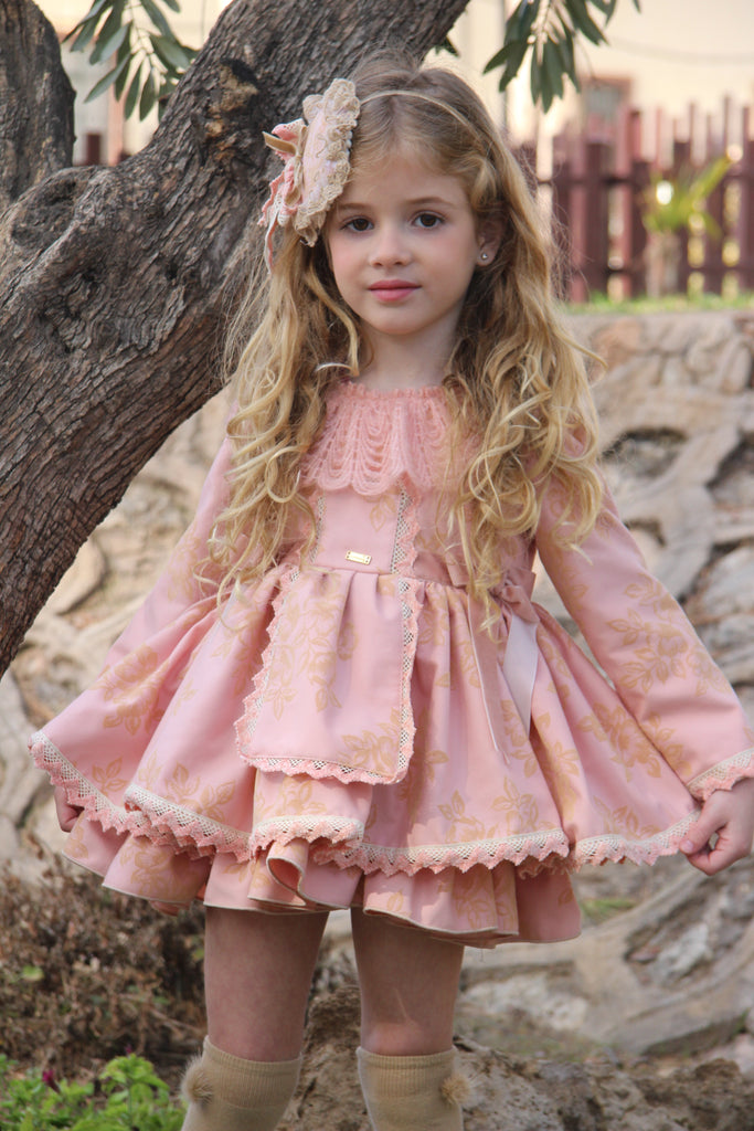 La Amapola Spanish girls pink puffball dress with beautiful flocked flowers and lace detailing. Finished with velvet side bows. In stock available for immediate shipping.