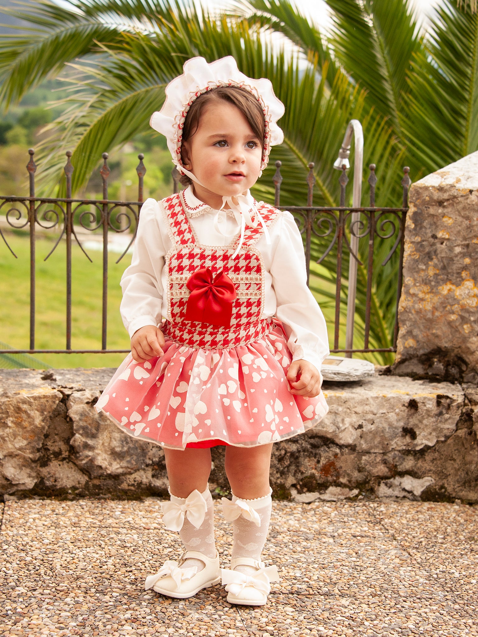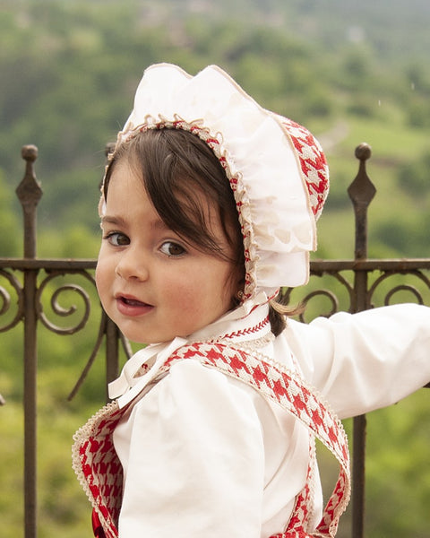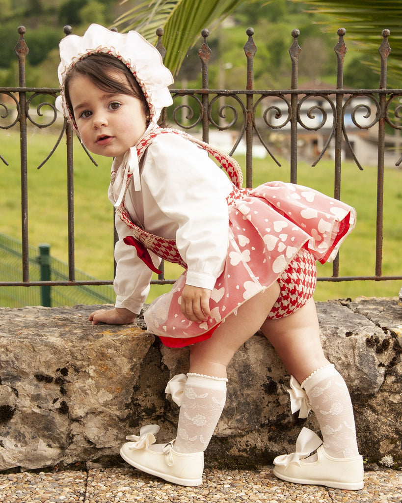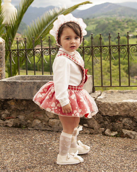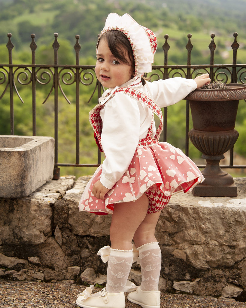 This item is made to order and takes approximately 8 weeks to arrive from the order date (if you need the item sooner please message us to discuss this). Beautiful Spanish girls red dogstooth skort with cute heart overlace and a matching blouse by Sonata infantil.