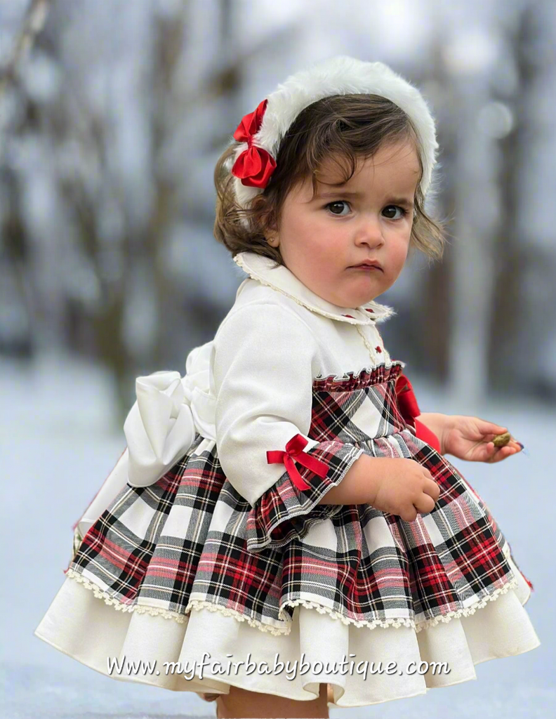 Sonata Infantil AW25 Spanish Girls Ivory Velvet & Red Plaid Christmas Puffball Dress IN2503 ~ MADE TO ORDER