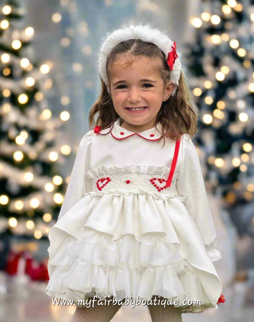 Sonata Infantil AW25 Spanish Girls white smocked heart Puffball Dress. True to size fitting. The matching headband, socks and shoes are available separately. Order by the 5th November for guaranteed xmas delivery! This item is made to order and takes approximately 8 weeks to arrive from the order date. Kindly note items which are ' made to order' are exempt from a return as they are ordered in by customer request. If you need measurements, please message us before ordering.
