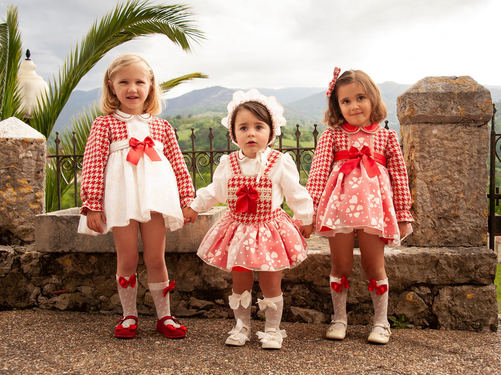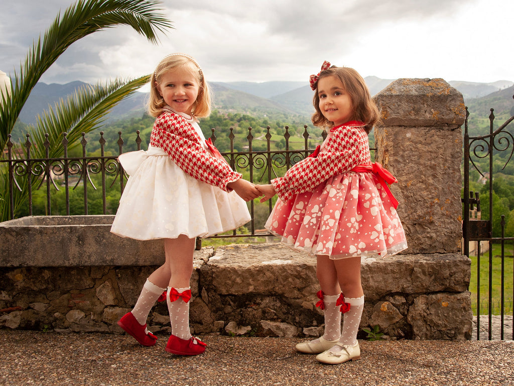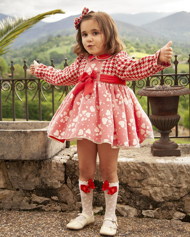 Beautiful Spanish girls red dogtooth puffball dress with a cream heart printed lace by Sonata Infantil. The matching beret and lace red bow socks are available separately. We have 1x 3y dress, beret and socks in stock now available for immediate shipping. Payment plans are available.