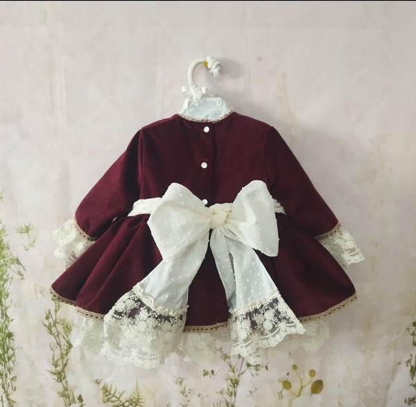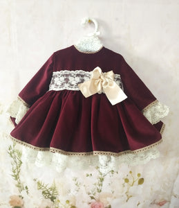 Sonata Spanish baby girls burgundy puffball dress with cream lace and a gold chest bow. Includes pants. We have one 12m in stock ready to dispatch.