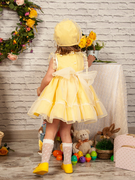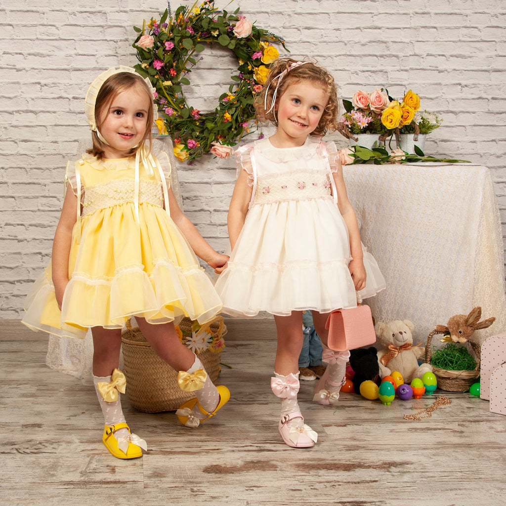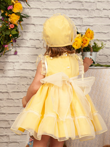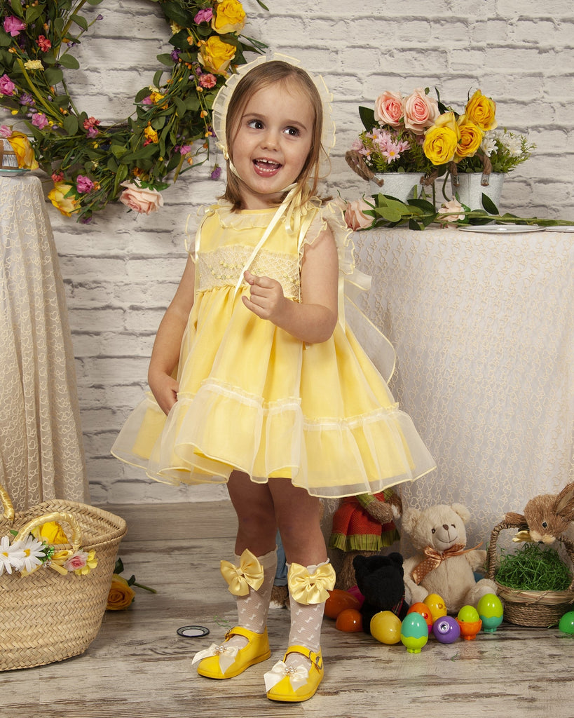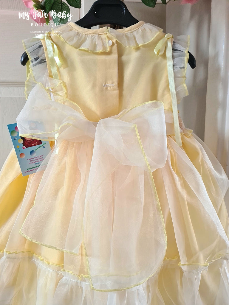 Sonata Infantil traditional Spanish girls lemon organza smocked dress with satin shoulder ribbons and a large back bow. True to size fitting. In stock now available for immediate dispatch.