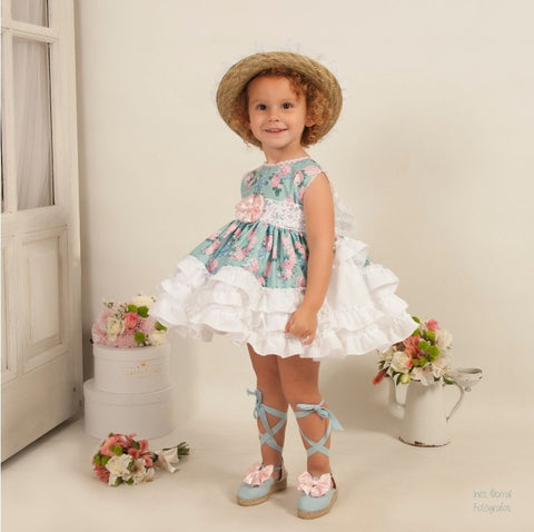 Sonata Infantil Spanish girls blue & pink floral puffball dress with lace trim. True to size fitting. Optional bonnet available. Matching shoes available separately. These items are made to order and take approximately 8 weeks to arrive from the order date. Kindly note items which are 'made to order' are exempt from a return as they are ordered in by customer request.