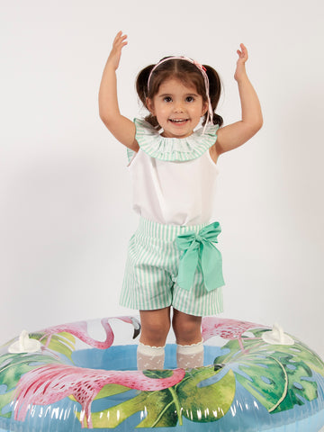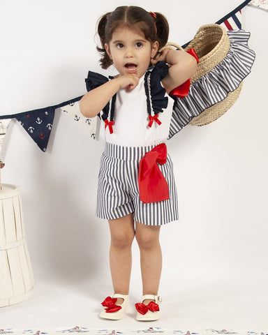 Sonata Infantil Spanish girls pink & lilac plumeti summer top, matched with a pair of lilac shorts. Matching accessories are available separately. True to size fitting. This product is made to order and will take approximately 6 weeks to arrive from the order date. Kindly note items which are 'Made to order' are exempt from a return, as they are ordered in by customer request. If you need measurements before ordering, please send us a message via email, or contact us on Facebook My Fair Baby Boutique - Home | Facebook or Instagram @my_fair_baby_boutique
