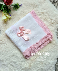 Spanish baby girls white knitted blanket with a beautiful pink lace edge, finished with a large pink satin bow.