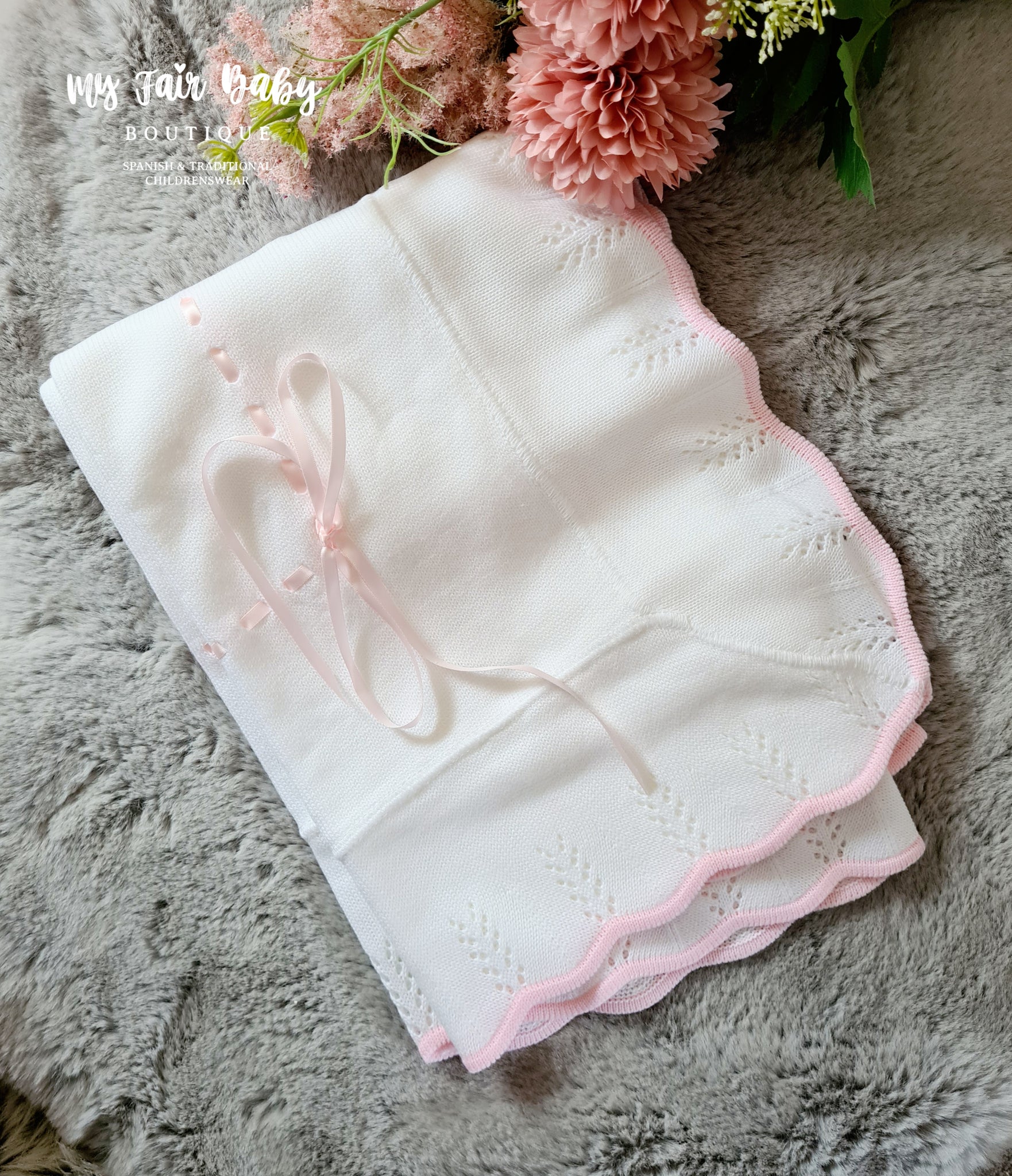Spanish Style Baby Girls White & Pink Ribbon Slot Shawl / Blanket