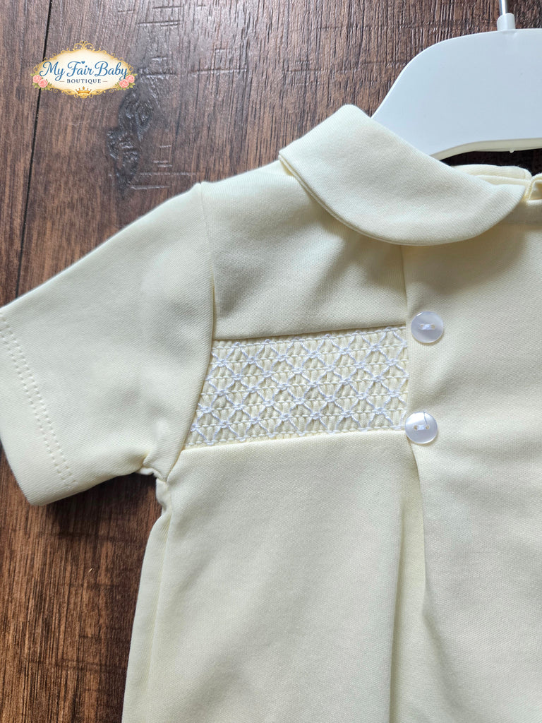 Spanish baby boys lemon cotton smocked romper with button fastening to the back and legs. 100% cotton. True to size fitting