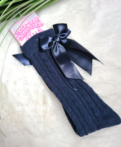 Spanish style girls white knee high socks with a long satin back bow. Other colours are available.
