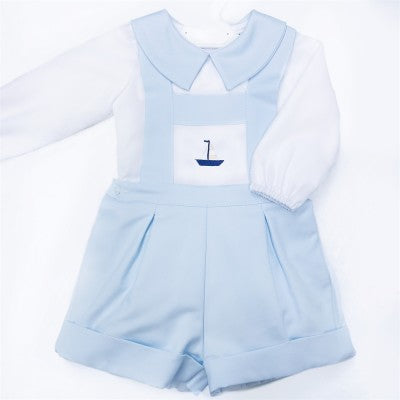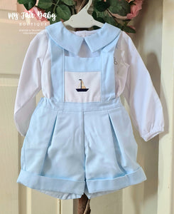 Wee Me Spanish baby boys blue dungarees with a cute sail boat motif. Matched with a long sleeved cotton shirt with coordinating collar. True to size fitting.