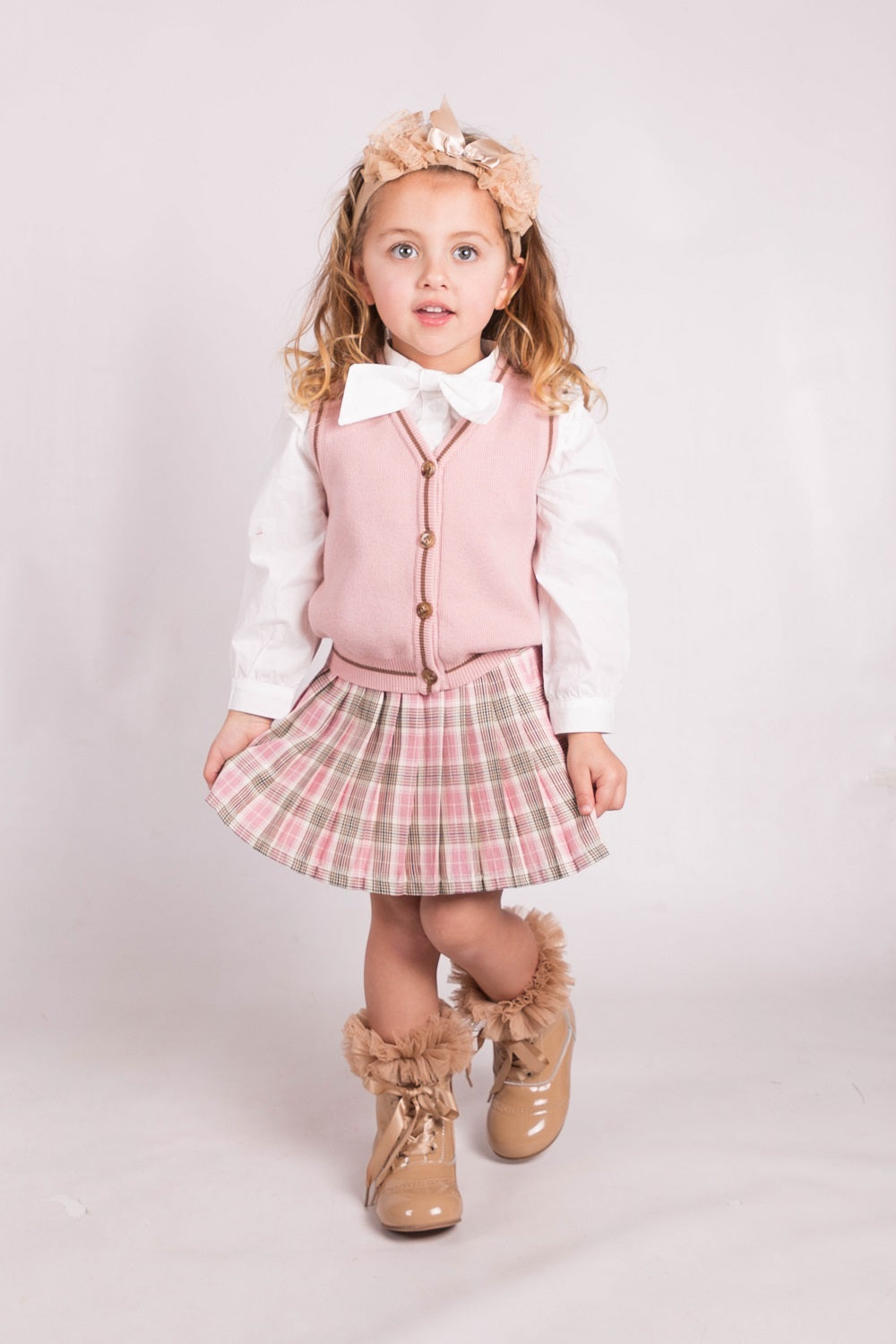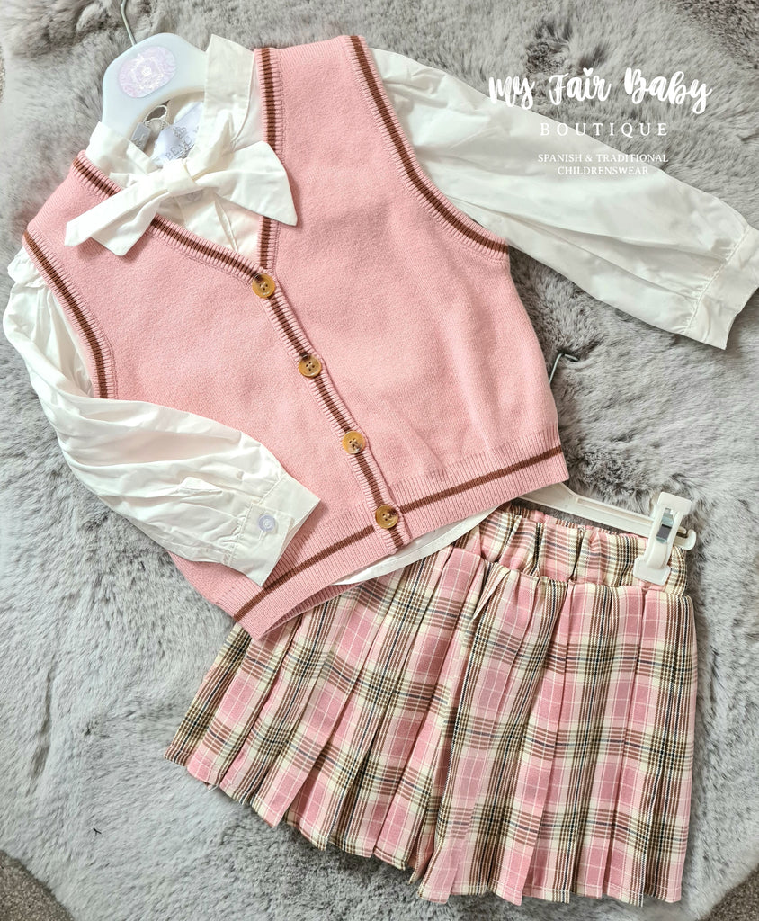Beau kid girls pink tartan skirt, matched with a white long sleeved blouse and a knitted tank top. True to size fitting.