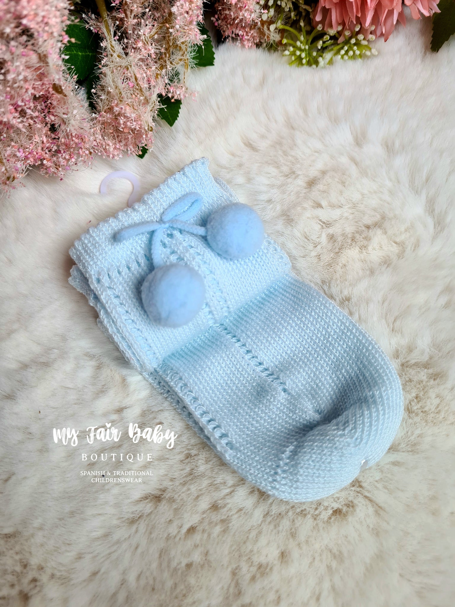 Spanish girls and boys ankle socks with side pom pom detailing. Please take care with the pom poms and do not leave young children unaccompanied with them. Wash inside out.